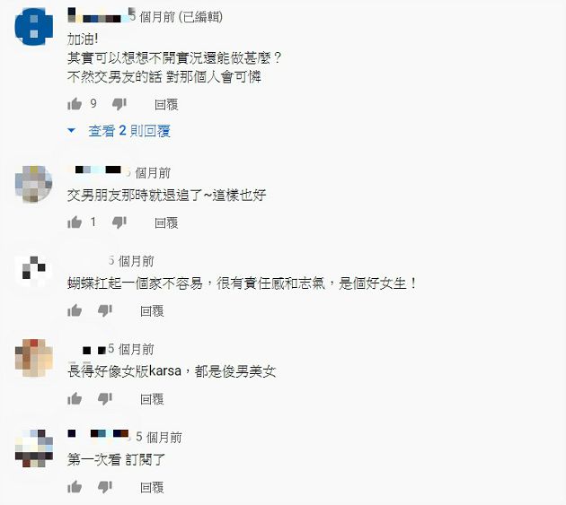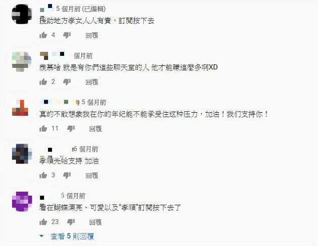 蝴蝶兒的家庭背景跟價值觀曝光後,吸引網友們熱烈討論,紛紛大讚她的行為,「蝴蝶好孝順,辛苦了」、「小蝶真的是特別好的女孩子,大家多多支持呀!」、「養家辛苦我懂,我訂閱,加油,孝順的應該有好報!」、「我這個人很簡單,有小蝶就給讚!」、「援助地方孝女人人有責,訂閱按下去」、「真不敢想像我在你的年紀能不能承受住這種壓力…」、「真是個愛家的好阿姨」、「更愛蝴蝶了,很上進」、「蝴蝶扛起一個家不容易,很有責任感和志氣,是個好女生!」。