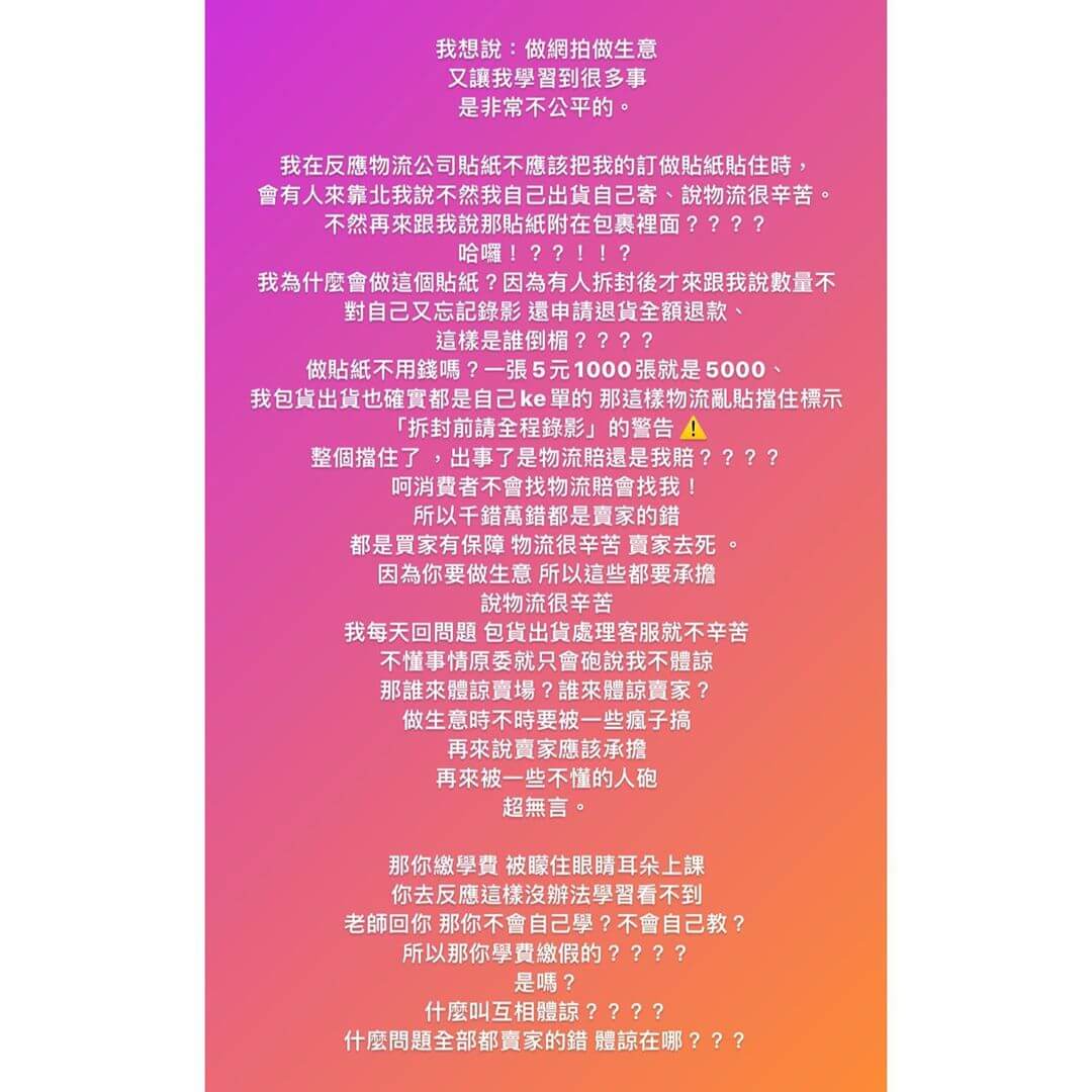 斯亞氣憤地表示,「很抱歉!我現在不是用公眾人物立場,我是用一個辛苦經營自己賣場的賣家在為自己發聲!」也特別在IG發文回應網友在Dcard上面的發文,「319樓所說的事情原委完全不同!」還說明自己就是因為遇到這件事,決定要訂做「拆封前請全程錄影,拆封後皆不接受退貨退款服務」的事先告知貼紙!