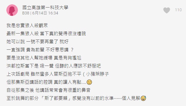 網友一開頭就先表示,「我是忠實狼人殺觀眾」,在最新一集的狼人殺裡,當下看到斯亞的行為,覺得很沒禮貌,「她可以說一號不要再暈了就好,但她一直強調貴為前輩,不好意思講?要是沒其他人幫她緩場,真是有夠尷尬!而洪都拉斯當下是哦一聲,但聽的人應該不舒服吧!」認為斯亞在節目中的態度也是不太有禮貌。不過,其他粉絲則認為,「當時是玩遊戲,也可能是節目效果」。