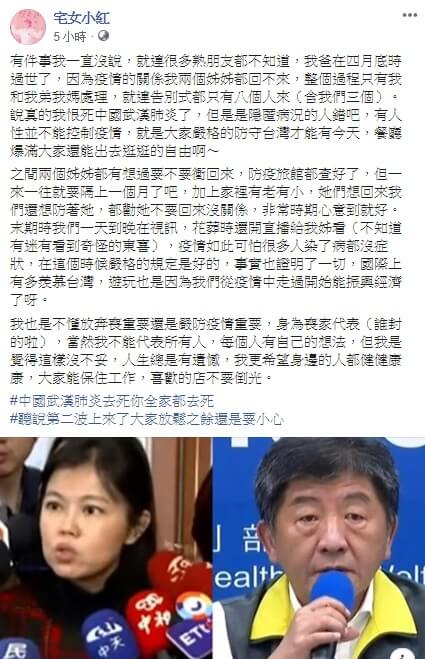 宅女小紅最近在社群平台上發文表示,「有件事一直沒說,連很熟的朋友都不知道,我爸在四月底過世了,但因為疫情的關係,兩個姊姊都回不來,整個過程只有我跟弟弟、媽媽處理,連告別式都只有8個人來(含我們三個)。」並透露自己恨死中國武漢肺炎,認為隱匿病況的人有錯,「有人性並不能控制疫情,是大家嚴格的防守,台灣才能有今天!」