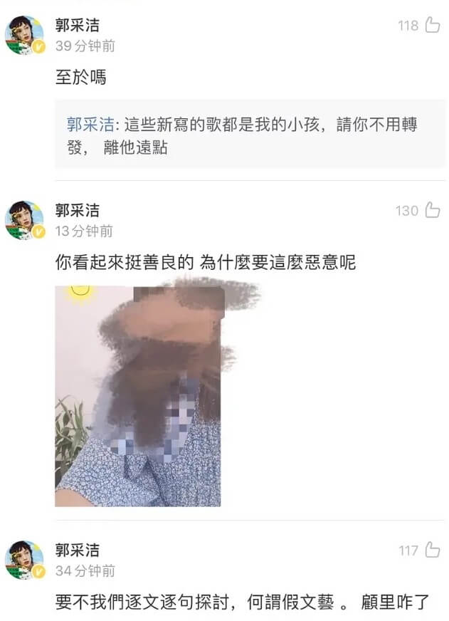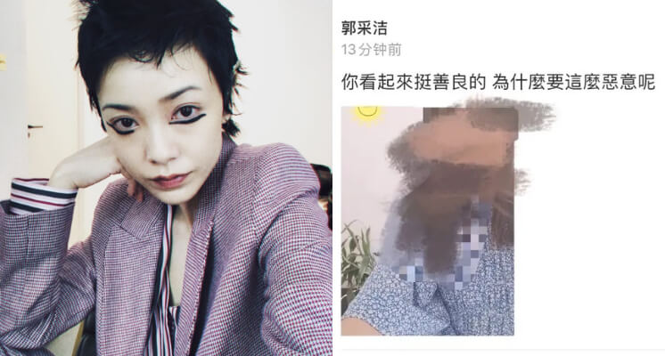 藝人郭采潔最近因為不滿自己的新歌被網友們瘋狂攻擊,便在微博上發文PO出女網友的照片,並在貼文內容中寫下,「你看起來挺善良的,為什麼這麼惡意呢?」讓不少網友看了都紛紛傻眼,認為郭采潔這樣公然的貼出女網友照片,根本就是要讓粉絲去公審對方,覺得郭采潔在使用網路暴力,後來郭采潔速速刪除貼文留言道歉,依然引起很大的討論!