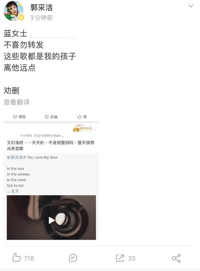 郭采潔最近在微博跟網友們分享她的新歌,沒想到竟有一位女網友轉發她的貼文並批評她的新歌還說她演技普普,只不過就是在小時代電影裡演了顧里才爆紅,「因為你本身就是顧里!」,讓郭采潔看到了之後感到不滿,將對方的貼文截圖之後轉PO到自己的微博上,還直接大方地Tag對方的帳號說,「藍女士,不喜勿轉發,這些歌都是我孩子,離他遠點!」