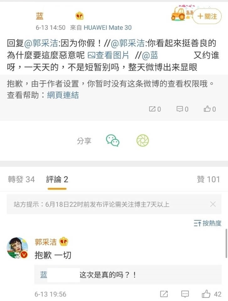 後來郭采潔也刪除了貼文,並且把所有公開網友的資訊都給刪掉,還直接到那位被她公審的網友的微博留言,「抱歉,一切!」讓網友驚訝又害怕的回覆說,「這次是真的嗎?」不過後來她也沒有再繼續回應網友,讓這件事就此了結。
