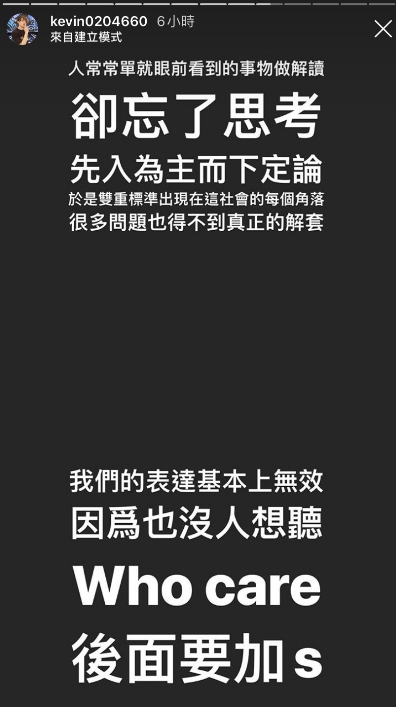 對於網路上的負面聲浪,酷炫也更新限時動態表示,人們常常單就眼前看到的事物做解讀,卻忘了思考,先入為主而下定論,「於是雙重標準出現在這社會的每個角落,很多問題也得不到真正的解套」。除了酷炫以外,孫生也發出一則全黑限動,「什麼是雙重標準?我今天見識到了」。