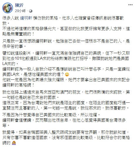 陳沂最近在臉書上貼出了鍾明軒的影片,並在貼文內容中寫道,「很多人說鍾明軒模仿我的風格,他本人確實也曾經傳訊息說很喜歡我,但他將這樣的風格發揚光大,甚至做的比我更好,擁有更多人支持,這點是無庸置疑的!」不過,陳沂認為有些事情她必須先跟鍾明軒講,「勉強自己去做一個根本不是自己的人,是很辛苦的事」。