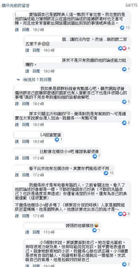 其他網友看完也都紛紛留言表示,「比較像在模仿小S吧!連語氣都很像」、「看不出來他有在模彷妳,其實你們風格很不同」、「我遇到偶像也不會講自己的名字,會說自己哪裡來的」、「覺得他有點可惜,能再進修更好」、「覺得他最近太刻意強調某些特質了,看了好彆扭」、「可以感覺到他的自卑感很重」、「越來越浮誇」。