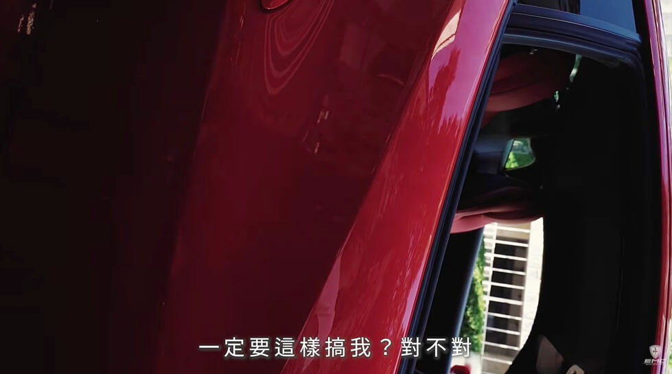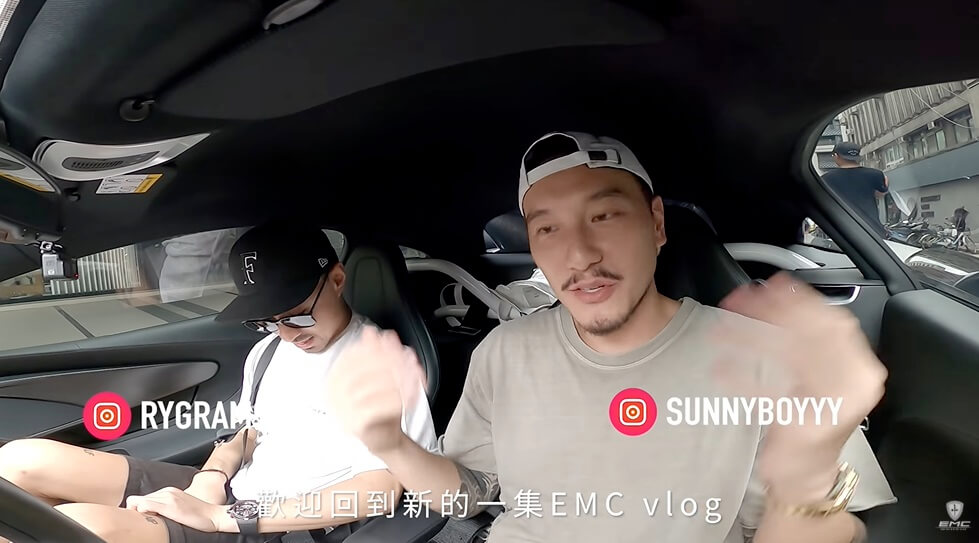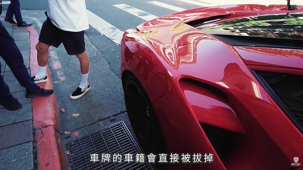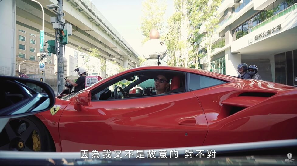 從「Empire Motor Club」的影片中可以看到,王陽明跟好朋友Ryan兩人一起介紹完車子之後,便決定各自開車上路,Ryan開著紅色的法拉利在忠孝東路上,只是車子前面沒有掛上車牌,被警察攔下來臨檢,警察直接告知說,「未懸掛車牌的部分,車牌、車籍會直接被拔掉」,讓Ryan傻眼的說,「哪有這樣,你別騙我,條文內容我都存在這裡!」