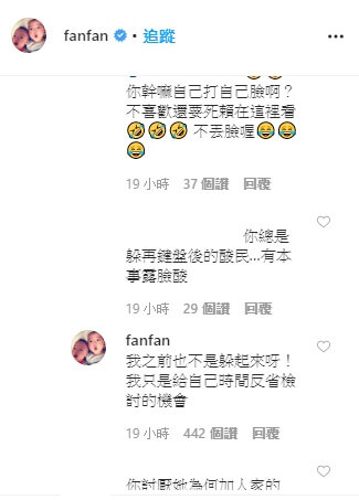 范瑋琪最近發了一則新的貼文,曬出自己在家裡練琴的影片,並在貼文內容中寫下,「太久沒練琴啦~手指完全不是自己的了」,而這一則新貼文也重啟了開放留言功能!不料,有網友看到范范發文竟直接留言說,「有事就躲起來,沒事了就沒完沒了的PO!(吐吐吐」。范瑋琪看到留言後也親自回覆說,「您別看了,讓眼睛休息一下吧!我之前也不是躲起來呀!我只是給自己時間反省檢討的機會」。