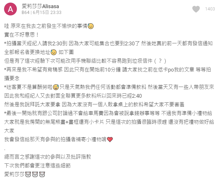 不料文章一出,立刻有不少迴響,問題也一一浮出,包括沒有演出費、更改地點通知不完善、遲到等,而愛莉莎莎本人也現身回覆,對於這些不愉快的事情感到抱歉,同時也解釋表示,拍攝前一天經紀人就發信通知更換地址,未來會再注意這部分,改用手機聯絡。