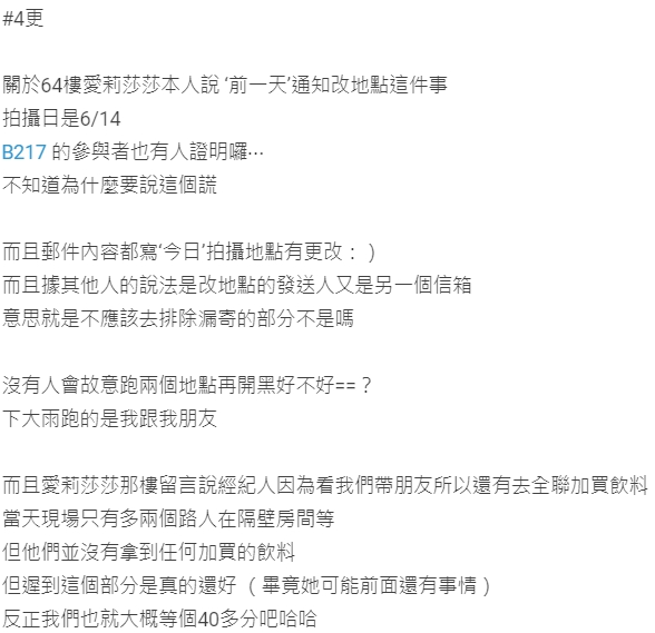 另外關於原PO提到拍攝太緊湊的部分,愛莉莎莎則表示自己不希望有背稿感,所以只有在開始前10分鐘,請大家準備之前PO過的文章來念;除此之外,桌上的飲料也並非酬勞,只是天氣熱有活動時就會準備飲料,莎莎當天看到來的人太多,因此又去買了更多飲料,才會耽誤時間;最後,車馬費部份則是和公司討論過後,認為又會被說「拿錢辦事」因此才作罷,不過會另外準備小禮物送給當天參與的拍攝者。