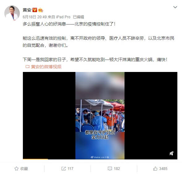 黃安最近在微博發文寫道,「多麼振奮人心的好消息!北京的疫情控制住了!能這麼迅速有效的控制,離不開政府的領導、醫療人員不辭辛勞,以及北京市民的自覺配合,謝謝你們!」並且提到自己下周一(22日)就可以回家,「希望不久就能吃到一頓大汗淋漓的重慶火鍋,痛快!」