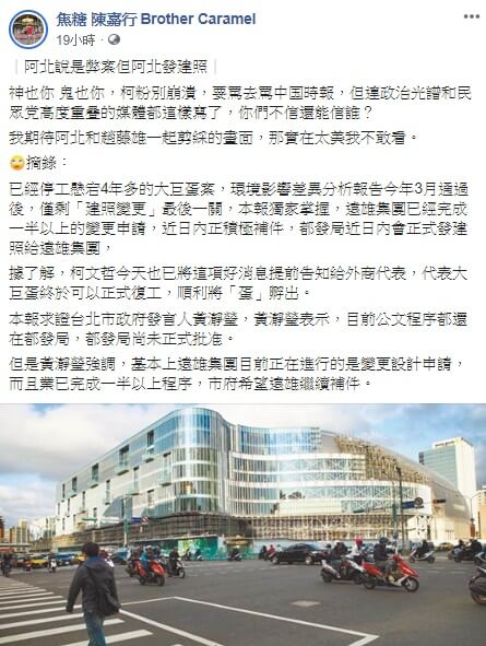 而北市建管處也在22日表示,針對遠雄建照變更設計案申請已經核准,最快連假過後6月底就可以申請復工了!對此,焦糖哥哥也在臉書發文寫道,「阿北說是弊案,但阿北發建照!神也你、鬼也你,柯粉別崩潰,我期待阿北跟趙藤雄一起剪綵的畫面,那實在太美我不敢看!」