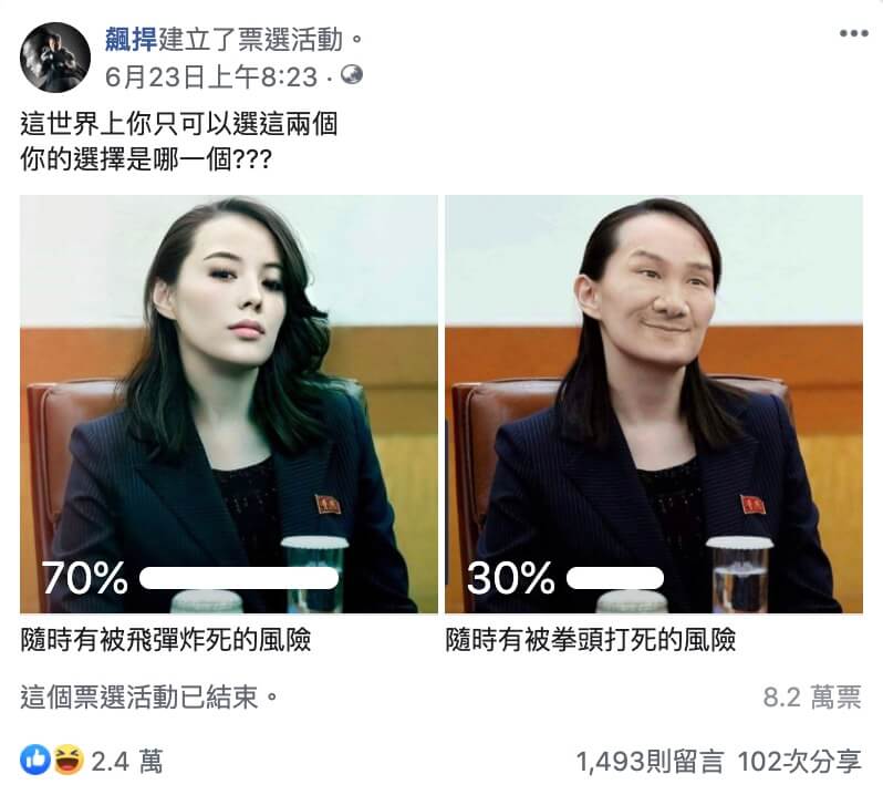 館長最近在臉書粉專舉辦了投票的活動,並在貼文內容寫道,「這世界上你只可以選這兩個,你的選擇是哪一個???」從貼文中可以看到,館長把自己的臉P在金與正的身上,並寫下「隨時有被拳頭打死的風險」,另一邊則是放著金與正的照片,並寫下「隨時有被飛彈炸死的風險」,讓網友們只能選一個~不料,竟然有70%的網友們都選擇了金與正,只有30%的網友選擇了女版的館長!