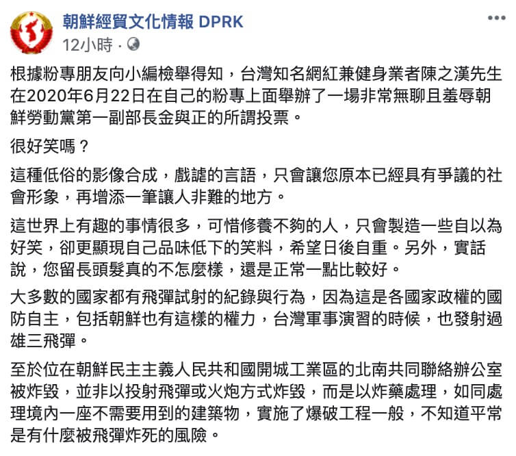 沒想到北韓的粉絲專頁「朝鮮經貿文化情報DPRK」竟然收到網友舉報,並且直接公開發文來抨擊館長的行為,「很好笑嗎?這種低俗的影像合成,戲謔的言語,只會讓您原本已經具有爭議的社會形象,再增添一筆讓人非難的地方。這世界上有趣的事情很多,可惜修養不夠的人,只會製造一些自以為好笑,卻更顯現自己品味低下的笑料,希望日後自重」。另外,粉專還特別強調,「說實話,您留長頭髮真的不怎麼樣,還是正常一點比較好!」