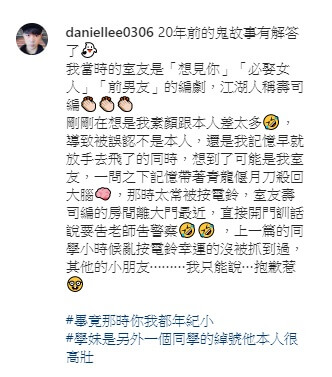 後來西瓜哥哥也有再度更新發文,跟大家解釋說,「20年前的鬼故事有解答了!剛剛在想是我素顏跟本人差太多,導致被誤認不是本人,還是我記憶早就放手去飛了的同時,想到了可能是我室友,一問之下記憶帶著青龍偃月刀殺回大腦,那時太常被按電鈴,室友的房間離大門最近,直接開門訓話說要吿老師吿警察,上一篇的同學小時候亂按電鈴幸運的沒被抓到過,其他的小朋友...我只能說...抱歉惹!」還透露自己的室友其實是大有來頭,「我當時的室友是『想見你』、『必娶女人』、『前男友』的編劇,江湖人稱壽司編!」讓不少網友都留言表示,「室友真的很有才耶!」、「好想被你室友兇兇看XD」。