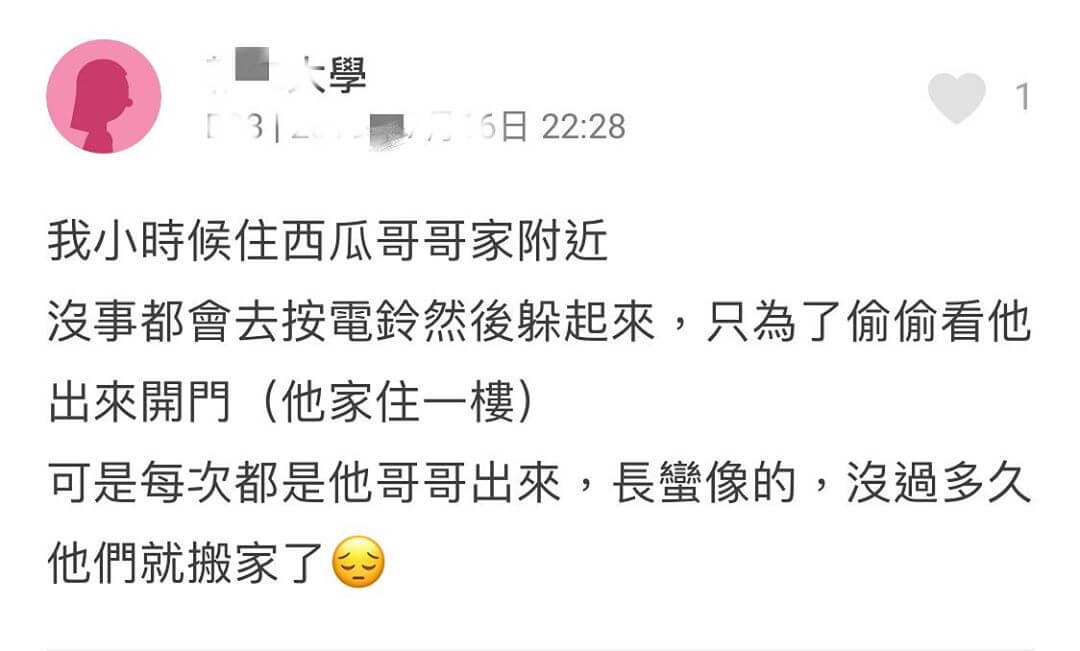 西瓜哥哥最近在IG上發文貼出了Dcard網友留言的截圖,讓大家可以看到這位網友說自己小時候都會去西瓜哥哥家按電鈴,「只為了偷看他出來開門」,但這位網友每次按完電鈴之後,認為「出來開門都是他哥哥,長得蠻像」,可惜沒多久西瓜哥哥他們就搬家了!