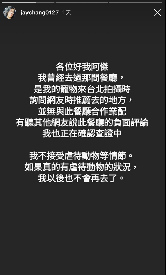 該店家因涉嫌虐待動物,引發大眾撻伐,紛紛湧入其臉書、IG狂罵,而從IG上可以看到,知名網紅「阿傑」這個月初才造訪該咖啡廳,店家曾將阿傑抱著小浣熊的照片貼出,因此阿傑也火速發出聲明表示,並沒有和該餐廳有業配合做,自己是在不知情的情況下前往餐廳,而他本人也絕對無法接受虐待寵物的行為,希望大家能理性處理,期盼各位的體諒。