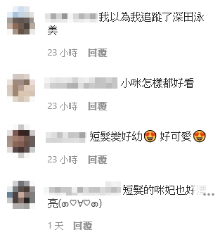 咪妃短髮照一出,也有網友瞬間將她認成女優「深田詠美」,紛紛留言表示,「我以為我追蹤了深田泳美」、「我真的以為是詠美」、「第一眼我還以為深田詠美...」、「深田老師好」。另外則有許多粉絲稱讚,直呼咪妃簡直「婆爆」,實在太漂亮!