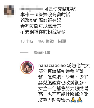 不過這則貼文也引來網友質疑,阿圓曾經整形過,但是如果一個普妹沒有動手術的話,能改變的應該很有限,盼阿圓可以寫清楚別誤導粉絲。對此,阿圓也現身回覆表示,粉絲們大部分都知道她有微整,但是減肥、少曬、少嬰兒肥確實也改變很多,「女生一定都會努力想變漂亮,也不可能什麼都沒做沒努力就變漂亮」。