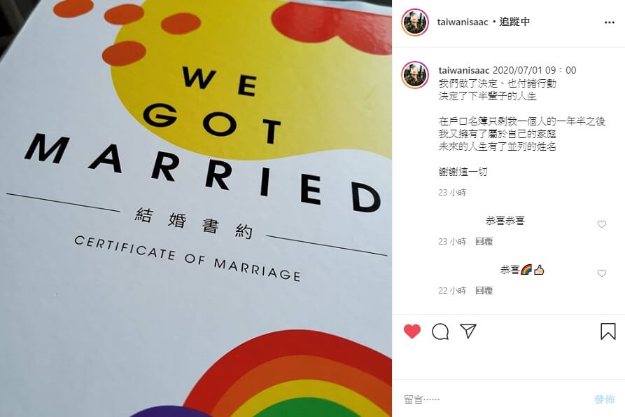 有著「王牌經紀人」封號的陳鎮川在1日宣布跟長跑9年的同性伴侶登記結婚,而他也在社群平台上大方地寫下,「我們做了決定、也付諸行動,決定了下半輩子的人生,在戶口名簿只剩我一個人的一年半之後,我又擁有了屬於自己的家庭,未來的人生有了並列的姓名,謝謝這一切!」讓不少粉絲、網友們看了都感動不已,紛紛湧入給予祝福!