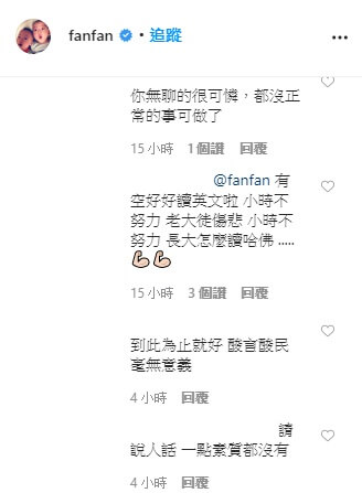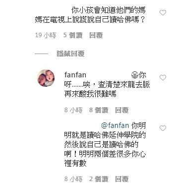 沒想到,竟然有網友開始留言攻擊她說,「小孩知道他們的媽媽在電視上說謊自己讀哈佛嗎?」、「你現在知道為什麼口罩缺貨了嗎?」、「你無聊的很可憐,都沒有正常的事可做!」、「有空好好讀英文,不然怎麼讀哈佛?」、「英文差,中文也差!」。
