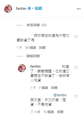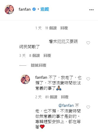而范范現在也已經不再選擇隱忍或是當作沒看到,直接非常霸氣的回應網友說,「你查清楚來龍去脈在來酸我很難嗎?」、「我知道缺貨的原因,現在也知道口罩不缺貨了,除非有人囤貨!」還有網友希望范范不要再在意酸民們說的話,希望她別再開戰,范范也回說,「不了,我老了,也懶了,不想浪費時間做沒意義的事了!」讓不少粉絲都紛紛按讚支持,還希望她趕快準備新專輯,大家都在等著呢!
