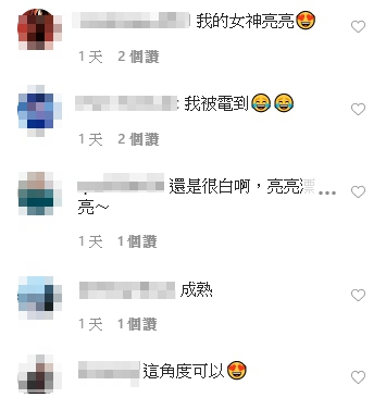 閃亮亮照片一出,立刻有不少粉絲大讚留言,「亮亮又變美了」、「超美超好看的!」、「被正到快不行了」、「清涼還是美」、「再清涼下去不行啊!」、「這什麼神仙身材」。同時也有網友發現亮亮似乎又變瘦了,紛紛提醒她多吃一點,注意身體健康。