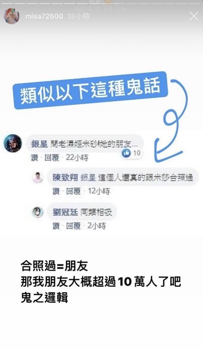 另外米砂也提到,動漫場次經常有人找她拍照,並上傳到自己的社群平台,基本上她不會拒絕合照邀請,但若合照過就等於朋友,那她的朋友大概會超過10萬人,批評這完全就是「鬼之邏輯」!而米砂也對這次發生的事情,感到十分遺憾,這次也不是想切割,而是因為和事實不符的太誇張,才決定出來說話。