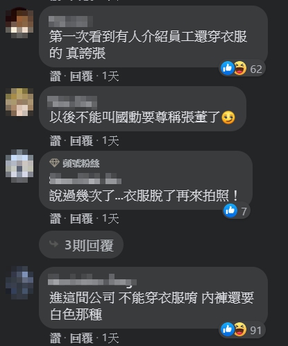 國動成立公司消息一出,立刻有不少粉絲留言表示,「第一次看到有人介紹員工還穿衣服的,真誇張」、「以後不能叫國動要尊稱張董了」、「說過幾次了...衣服脫了再來拍照!」、「在蹦蛙娛樂工作室內推廣硬漢娛樂第一位員工。國動牛逼!」、「主播也太沒禮貌!沒有人穿衣服在開公司的啦」、「弟弟最終還是得活在哥哥的陰影之下」。
