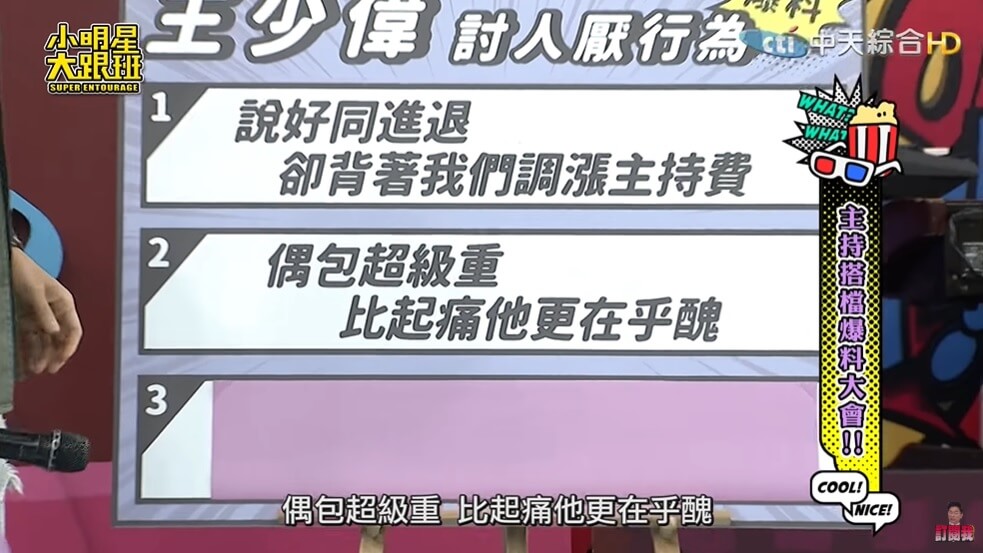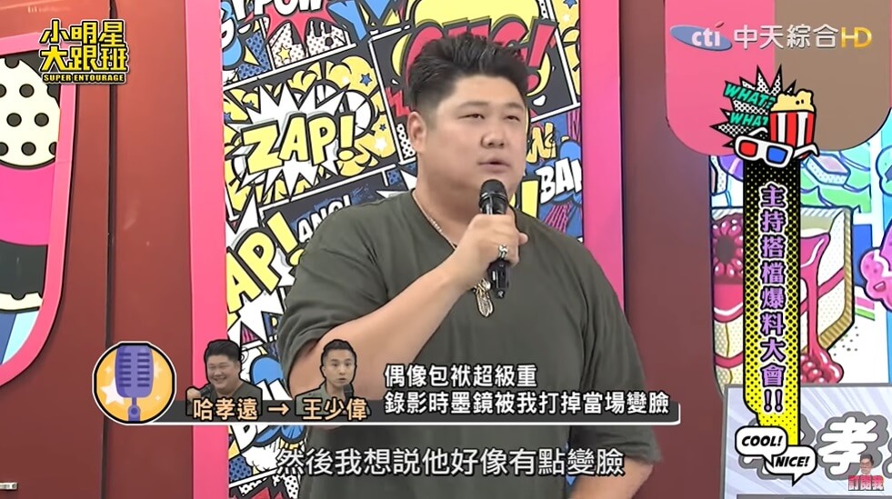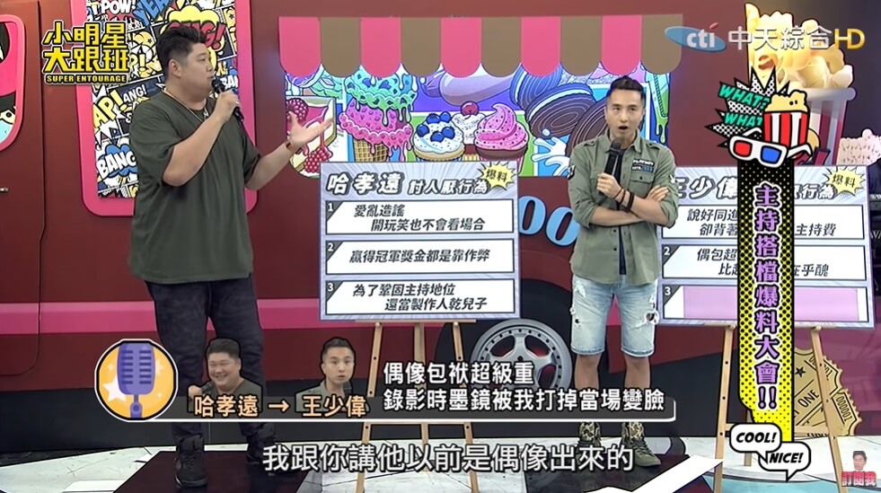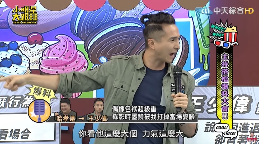 藝人王少偉跟哈孝遠一起主持節目《綜藝3國智》,節目播出至今也有4年的時間,在這段期間多多少少主持人之間都會有一些磨擦與磨合期,兩人最近也在上了《小明星大跟班》節目時,互相爆料並指控對方有那些令人討厭的一面!像是某次哈孝遠不小心丟球打到王少偉的臉,讓少偉直接爆嗆,「你很屌就對了?」讓哈孝遠嚇到不行!