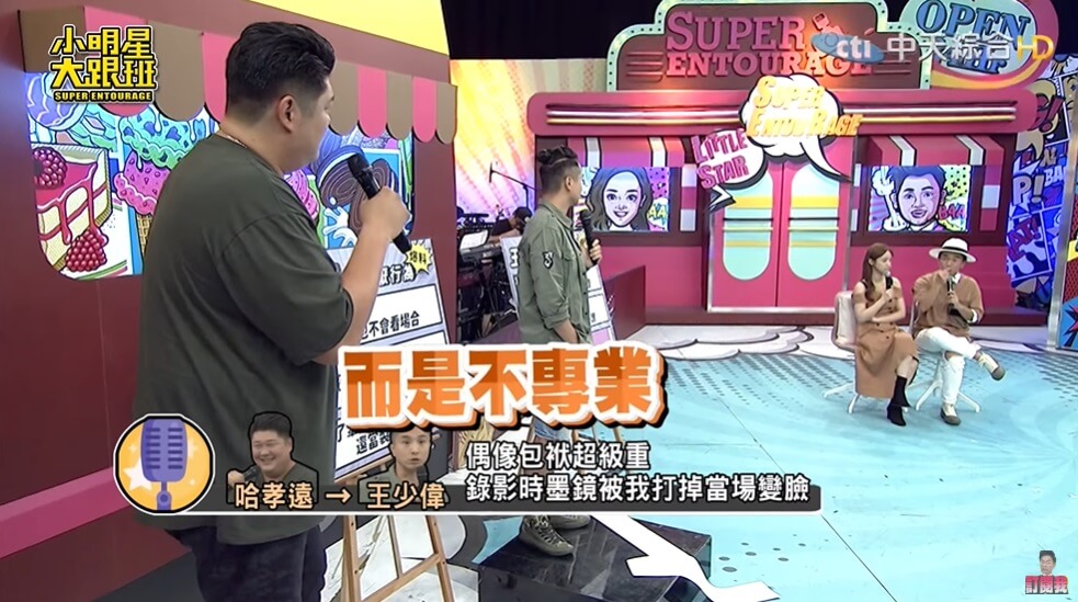 在最近播出的《小明星大跟班》節目中,哈孝遠直接大膽的控訴王少偉是一個偶像包袱很重的人,「比起痛,他更在乎醜~」,並且還原當下的狀況,是製作單位準備了一顆大球,「大家就你丟我、我丟你...然後我一不小心就拿出了以前打籃球的個性,把他當成敵隊的中鋒!」