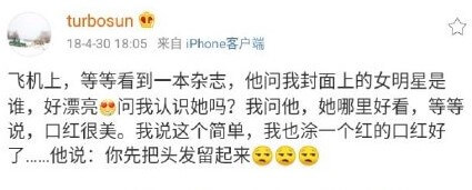 孫儷常在微博曬出與老公鄧超的甜蜜互動,她也曾在微博發文表示:「飛機上,他問我封面上的女明星是誰?好漂亮,我問他,他哪裡好看?他說口紅很美,我說這個簡單,我也塗一個紅的口紅好了,他說:你先把頭髮留起來。」似乎鄧超比較喜歡老婆長髮的樣子,近來孫儷睽違多年,終於把頭髮留長,也讓不少網友笑說:「超哥這次滿足了嗎?」