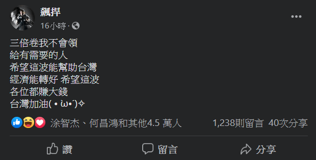館長12日在臉書發文寫道,「三倍券我不會領,給有需要的人,希望這波能幫助台灣,經濟能轉好,希望這波各位都賺大錢,台灣加油!」讓大批網友們看到後,引起了諸多反對的聲浪,大家都認為館長似乎誤會振興卷的用途!