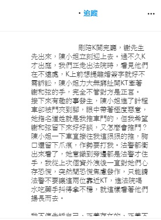 經紀人也提到,後來法警都衝出來看,「莉婭意識到旁邊都是法警才住手,我從上次個資外洩後一直對她們心存恐慌,突然間恐慌焦慮發作,只能請法警不要讓這兩位靠近KT,進法院喝水吃藥手抖得拿不穩,就這樣看著他們揚長而去...我不停告訴自己,正義存在的,正義不死!當你看過地獄,你就不怕魔鬼」。