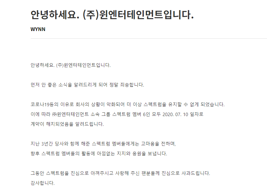 「SPECTRUM」的災難不僅僅於此,10日時,韓國男團「SPECTRUM」所屬經紀公司WYNN娛樂於官網宣布:「首先很抱歉為您帶來這個壞消息,由於新冠肺炎等之類的原因,該公司的狀況逐漸惡化,並無法繼續維持,因此WYNN Entertainment 所屬 SPECTRUM 的6名成員,將於2020年7月10日全數解約。感謝過去三年來一同合作的所有團員,並對於成員未來的活動給予全力的支持,我們衷心向所有珍惜與愛護SPECTRUM的歌迷致歉,謝謝。」消息一出,讓粉絲深感捨不得。