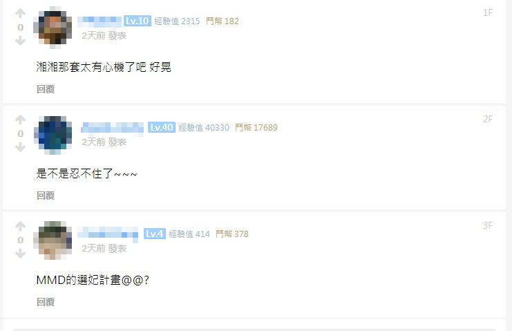 影片在網路上曝光後,大量網友湧入觀看實況,在實況中網友表示:「色瞇瞇真的到處汁」、「咪咪蛋?? 酒池肉林??」、「MMD彎腰了」、「走路卡卡的」、「MMD出來 好好走路」、「MMD的選妃計畫@@?」。