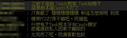 消息曝光後,吸引大量網友湧入PTT裡面留言討論,留言表示:「之前不是說 Candy刺客 Tank站樁? 結果根本是Candy不打了」、「JT無敵了 穩穩穩穩穩穩 幹這怎麼倒啊 到底」、「糖果PCS打得不錯吧,祝福他」、「什麼鬼?Tank根本沒有Candy穩定」、「感覺應該私人因素才離隊的」、「太突然了吧,我滿喜歡他欸」。