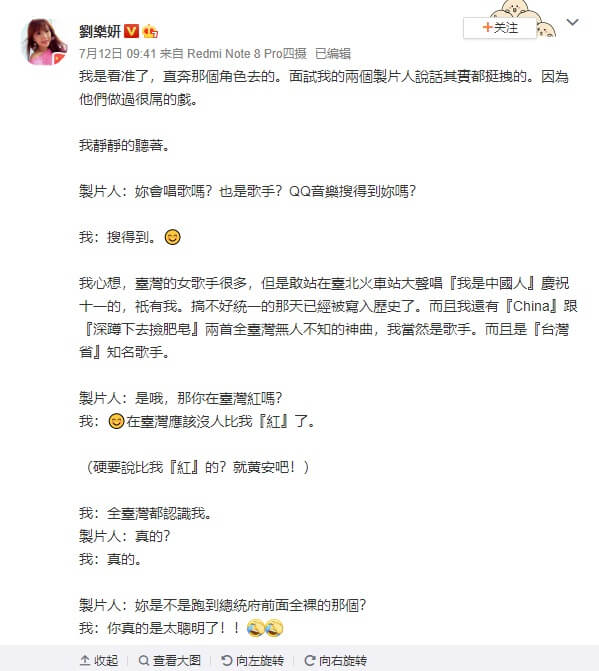 接著劉樂妍還心想著,「台灣女歌手很多,但敢站在台北火車站大聲唱『我是中國人』慶祝十一的,只有我!搞不好統一那天已經被寫入歷史,而且我還有『China』跟『深蹲下去撿肥皂』,兩首全台灣無人不知的神曲,我當然是歌手~而且是『台灣省』知名歌手!」