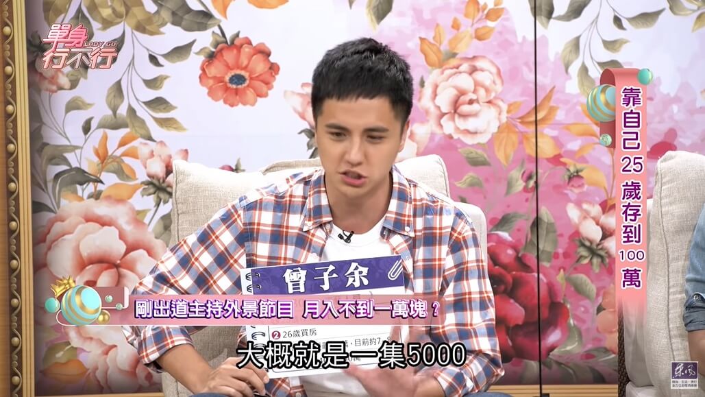 曾子余最近在《單身行不行》節目中,跟大家分享自己在25歲就存到了人生「第一桶金」,他也提到自己的工作過程,「剛開始運氣比較好,進到《食尚玩家》主持陣容裡,那時候一集酬勞只有5000元,抽成之後只剩3000,一個月只拍4集,等於一個月只賺1萬2而已!」可以說是相當的少,在台北生活會過得相當拮据。