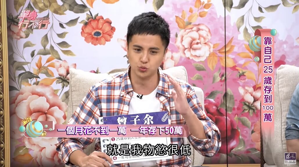 後來,在他出道一段時間之後,薪水也漸漸調高,扣除房貸、車貸跟孝親費,一個月至少可以存到5、6萬元,一年下來他能夠存到50萬!曾子余也透露,「我一個月花不到1萬,除了停車費跟加油,吃飯都是吃劇組的便當,上通告也有便當,有多的還可以帶回家分媽媽吃,很多地方都可以省錢!」
