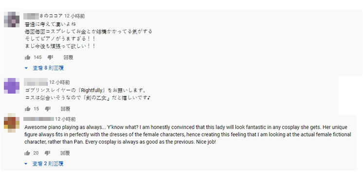 在這次新冠肺炎影響下眾多YouTuber宣布營收銳減,而「Pan Piano」卻靠著Cosplay 成各種知名的性感動漫角色,加上鋼琴演奏,成功在YouTube圈乘勢而起,其中有數支影片更是高達數百萬的點擊率,吸引了許多國內外的網友前來關注,其中多以日本網友為主,打入國際市場,讓自己的頻道更上一層樓。