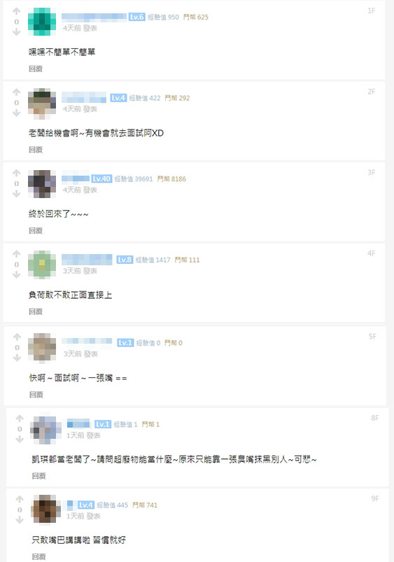 影片在實況中曝光後,有人將成剪成精華轉貼至遊戲大亂鬪論壇,許多網友紛紛留言表示:「嘿嘿不簡單不簡單」、「老闆給機會啊~有機會就去面試阿XD」、「終於回來了~~~」、「負荷敢不敢正面直接上」、「快啊~面試啊~一張嘴 ==」、「凱琪都當老闆了~請問超廢物能當什麼~原來只能靠一張臭嘴抹黑別人~可悲~」、「只敢嘴巴講講啦 習慣就好」。