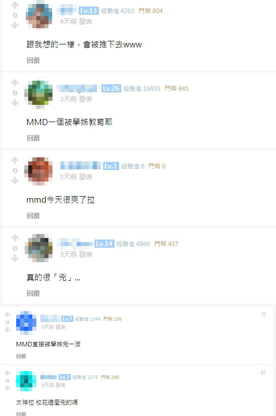 影片在網路上曝光後,有人將影片剪成精華放上遊戲大亂鬥論壇,引起網友大量討論,「跟我想的一樣,會被推下去www」、「MMD一個被學姊教育耶」、「mmd今天很爽了拉」、「真的很「兇」...」、「MMD直接被學姊兇一波」、「太神拉 校花這麼兇的嗎」。