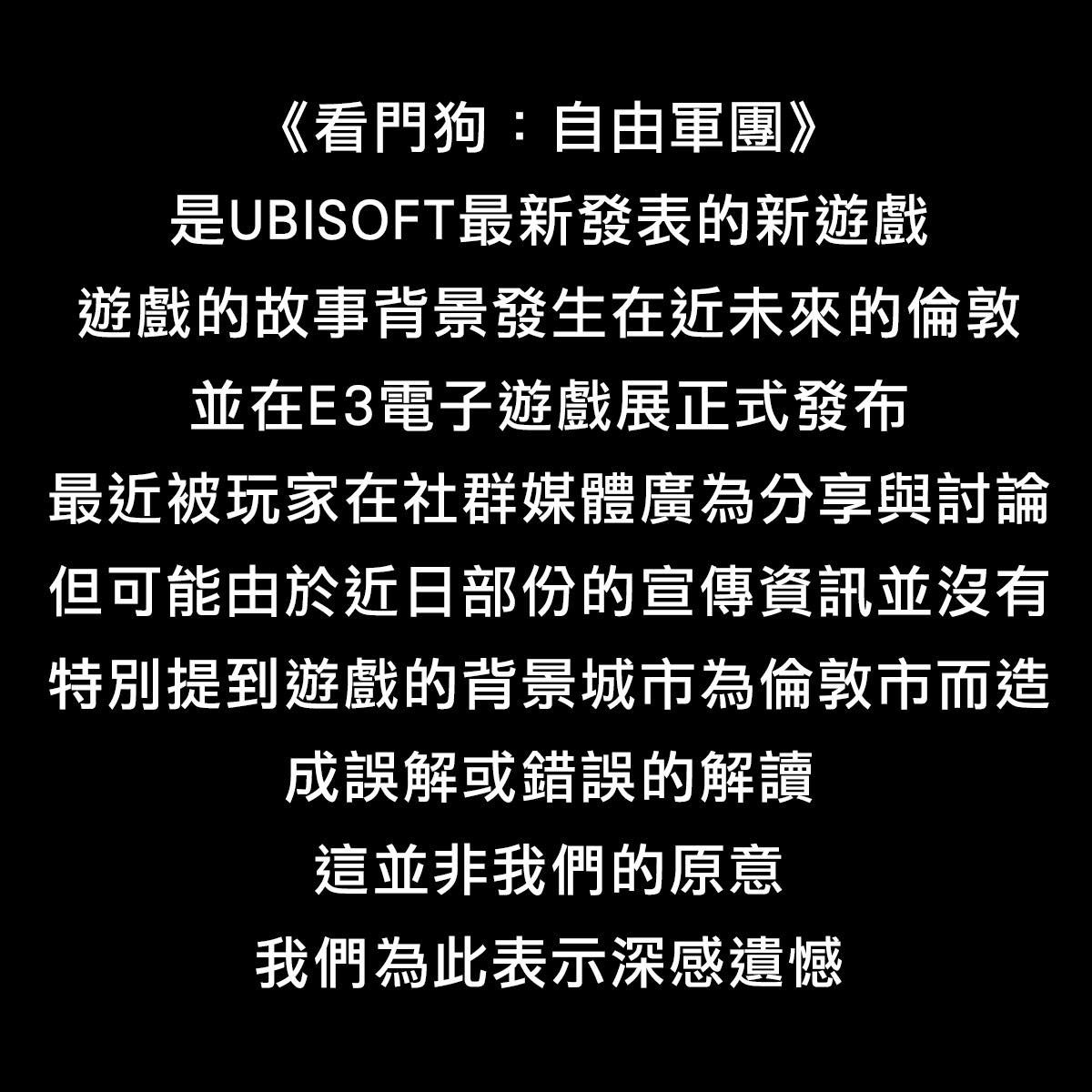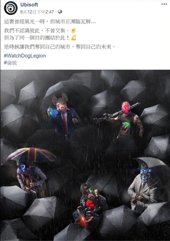去年6月時,Ubisoft曾於粉絲專頁張貼了一張撐著「黑雨傘」的宣傳圖,當時引來大量網友湧入留言,詢問是否是在暗指香港?隨後不久Ubisoft便發了聲明表示,「該遊戲故事背景是發生在近未來的倫敦,由於近日部分宣傳資訊並沒有特別提到遊戲背景,造成了誤解或錯誤解讀,我們深表遺憾。」