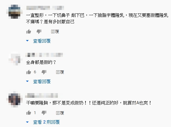 超直白影片一出,引來不少人關注,其中也有不少負評,「奶大有何意義?一次又一次整形,對你很失望!你已經是一個改造人,不是真正的自己!」、「全身都是假的?」、「一直整形,一下切鼻子 削下巴,一下抽脂字體隆乳,現在又要塞假體隆乳,不痛嗎?是有多討厭自己」、「虛榮心的假奶」、「已退訂」。雖然引來不少負評,不過大多數網友仍十分支持超直白,佩服她追求美的勇氣,也盼對整形有負面觀感的網友可以尊重超直白的勇氣。
