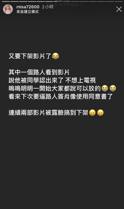 不料,「綠茶婊」影片還沒重新上架,另一部剛發的新片也遇到相同情況,連續兩部片都因「露臉」而下架!米砂日前上傳新的街訪影片,沒想到其中一名路人,因為被同學認出來,所以私訊表示不想上電視,讓米砂感到十分無奈下架影片處理,「明明一開始大家都說可以放的,看來下次要逼路人簽肖像使用同意書了」。