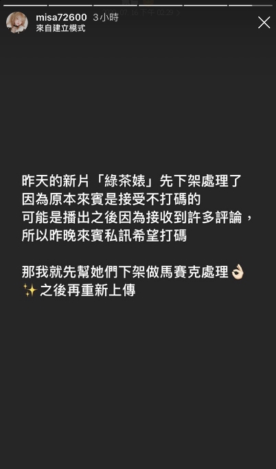 前陣子米砂上傳新片,討論「綠茶婊」相關話題,拍攝時來賓接受不打碼上片,不料影片播出後,由於收到許多評論,因此來賓表示希望能打馬賽克,最後米砂決定先將影片下架,做好馬賽克處理後再上片。