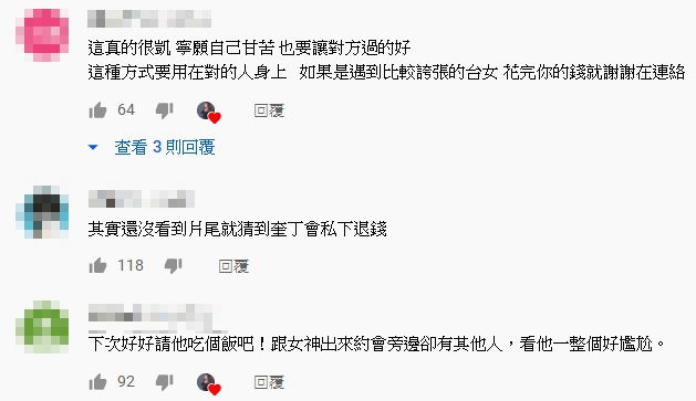 拍攝結束後,奎丁也將一日花費全數還給小唐,約定下次有機會再讓對方請客!奎丁影片一出,立刻引來不少網友留言,「這真的很凱,寧願自己甘苦,也要讓對方過的好 」、「還沒看到片尾就猜到奎丁會私下退錢」、「人品真的hen好,最後把錢還了人家,比其他youtuber做完測試就不了了之的態度,更讓人敬佩」、「我很讚同丁姐說的,看能力付出,讚歎丁姐」、「看完會想努力上班哈哈」。