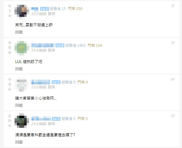消息曝光後,有人將消息轉貼至遊戲大亂鬪論壇,引起許多網友熱議,紛紛留言表示:「笑死...國動不服還上訴」、「LUL 這就認了吧」、「請大家留言小心被告阿...」、「猜猜是要易科罰金還是要進去蹲了?」。