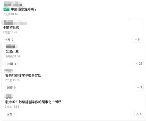 消息一曝光後,在各大平台上不脛而走,許多網友紛紛留言表示:「中國還會意外嗎?」、「中國特供版」、「就是山寨」、「智慧財產權在中國就是個笑話」、「抄襲牆國」。